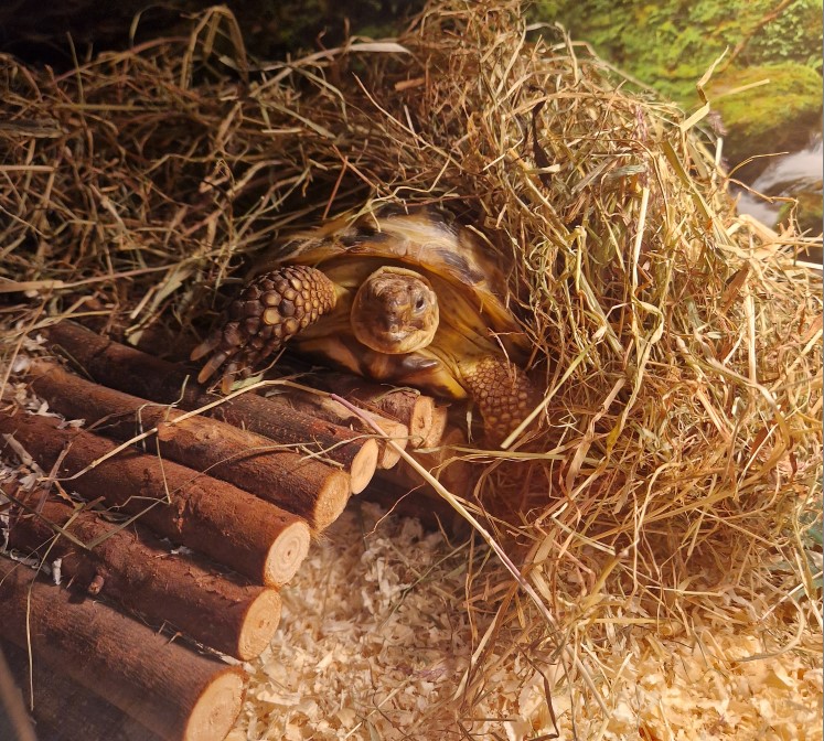 During the day, Sydney likes to lie under his heat lamp to get nice and warm; at night-time he likes to find somewhere nice and dark (usually under his hay) to fall asleep. Sydney does like to sleep with his head and legs outside of his shell, but this is nothing to worry about - it just means that he is really happy.